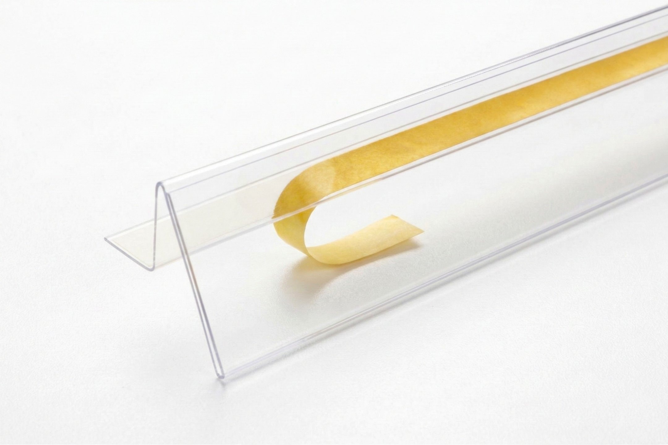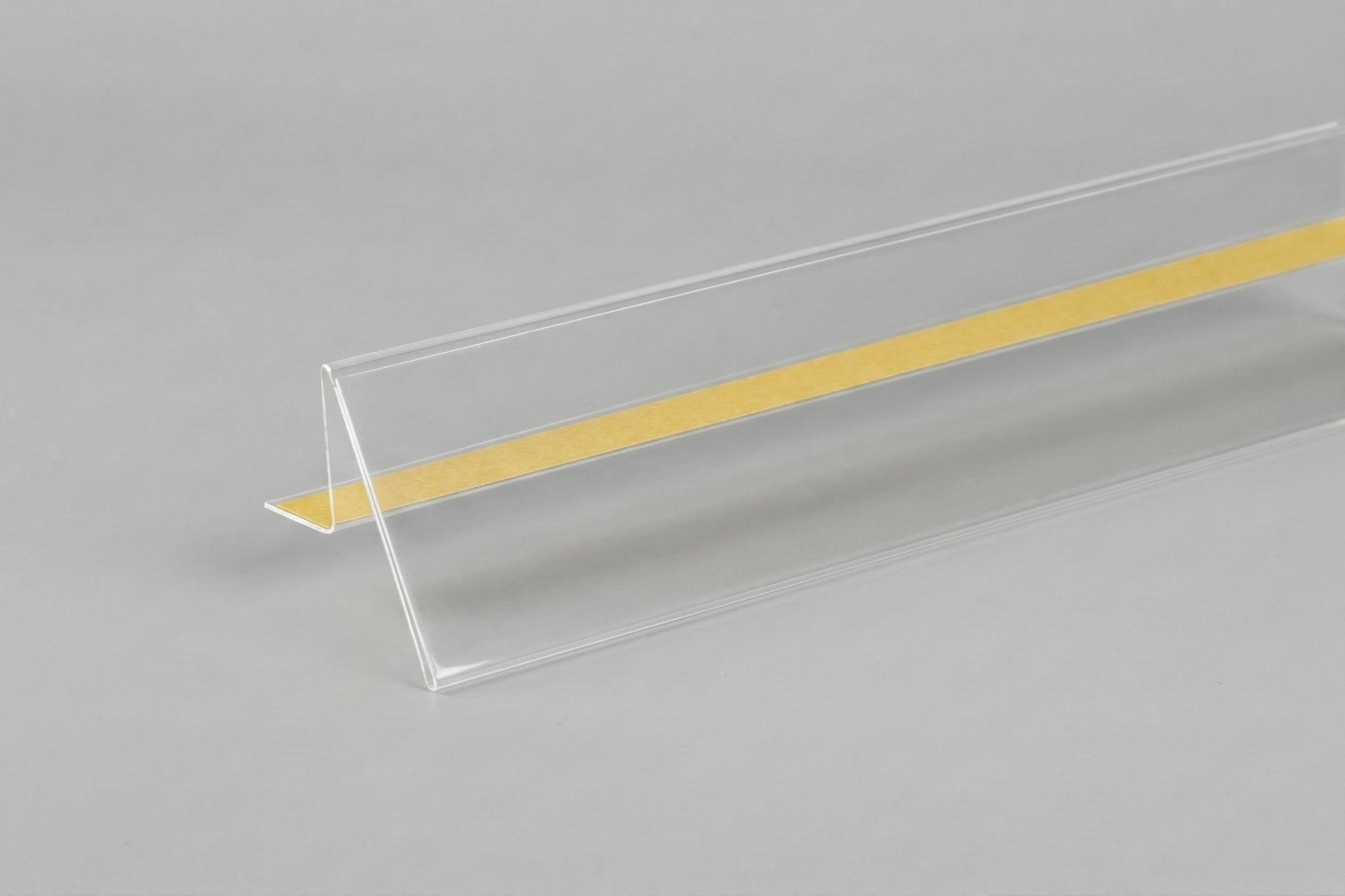 Plastic self-adhesive shelf rail for inserting labels, price tags, barcodes and labels. Use on sales and warehouse shelves, presentation stands, display cases, in warehouse management. The bar is manufactured by hot bending of plastic tape. The shape and design can be changed even for smaller series. For production we use hard clear PVC or PET from the German manufacturer Klöckner Pentaplast with glossy or matt (anti-reflective) surface. The matt surface is more scratch resistant, but can make it difficult to read barcodes. Standard self-adhesive transparent rubber tape FG150 thickness. 0.13 mm is suitable for bonding to smooth surfaces such as glass, laminated board, painted sheet metal, etc. On request, the clear, strong adhesive acrylic tape IFP390 thickness. 0.2 mm or white foam tape IGF2900 thickness 1.0 mm. The foam tape is also suitable for bonding to coarser textured surfaces such as warehouse or used shelving. The tape can be produced in a maximum length of 1250 mm. The background colour can be solved by inserting coloured plastic strips and imitation wood. On request, we can produce the mouldings in non-standard dimensions or in a different design. We also produce the mouldings in magnetic design. You buy from the manufacturer