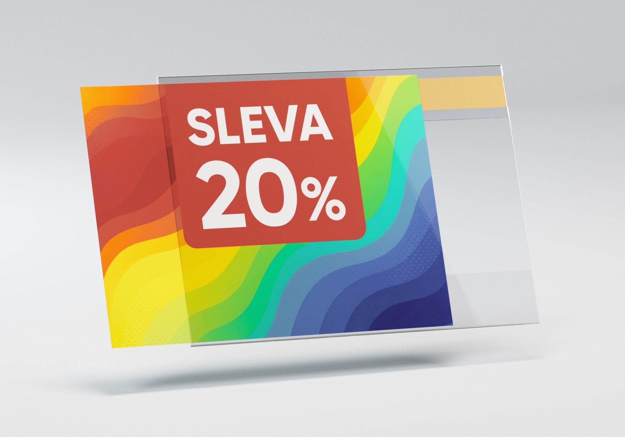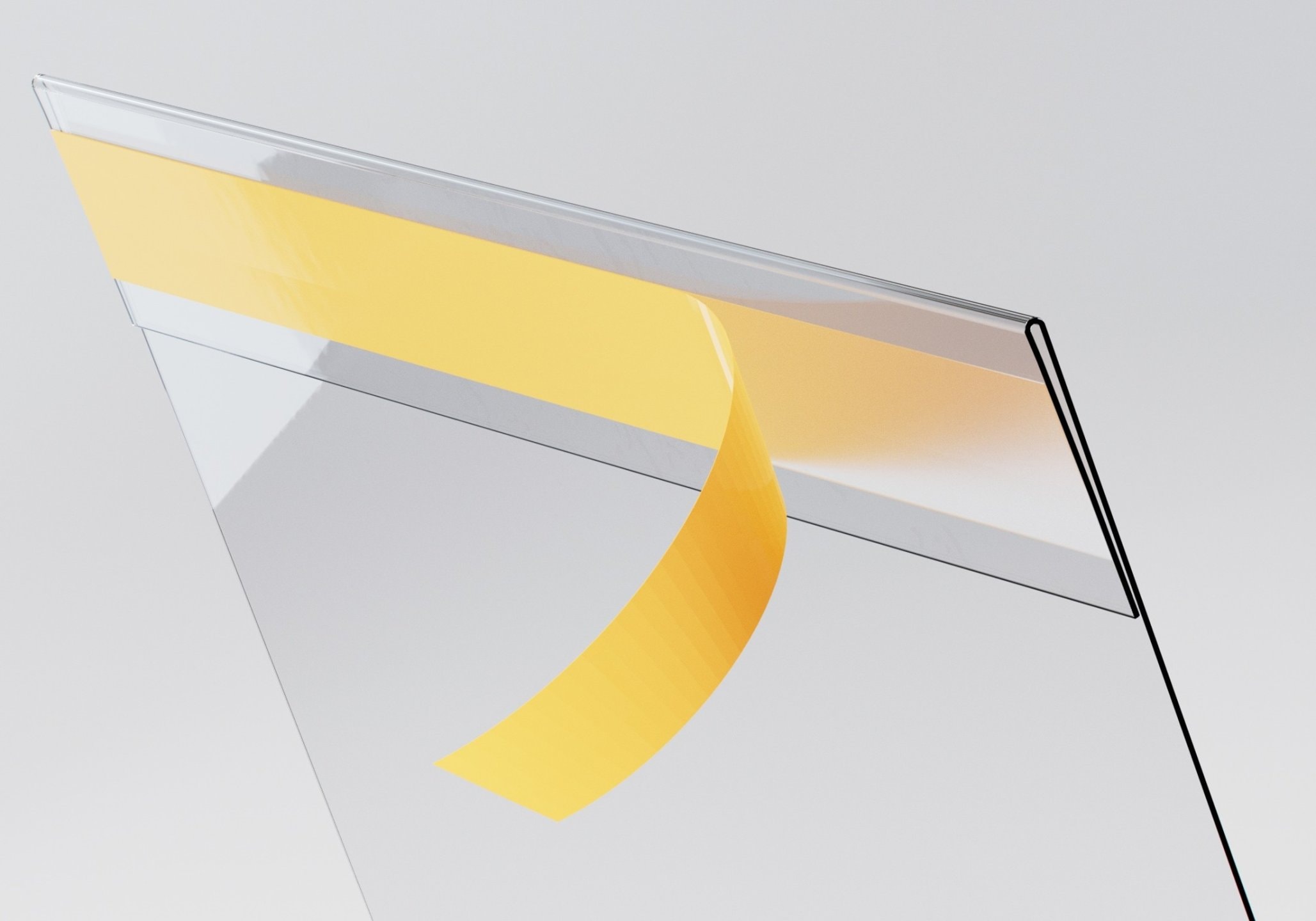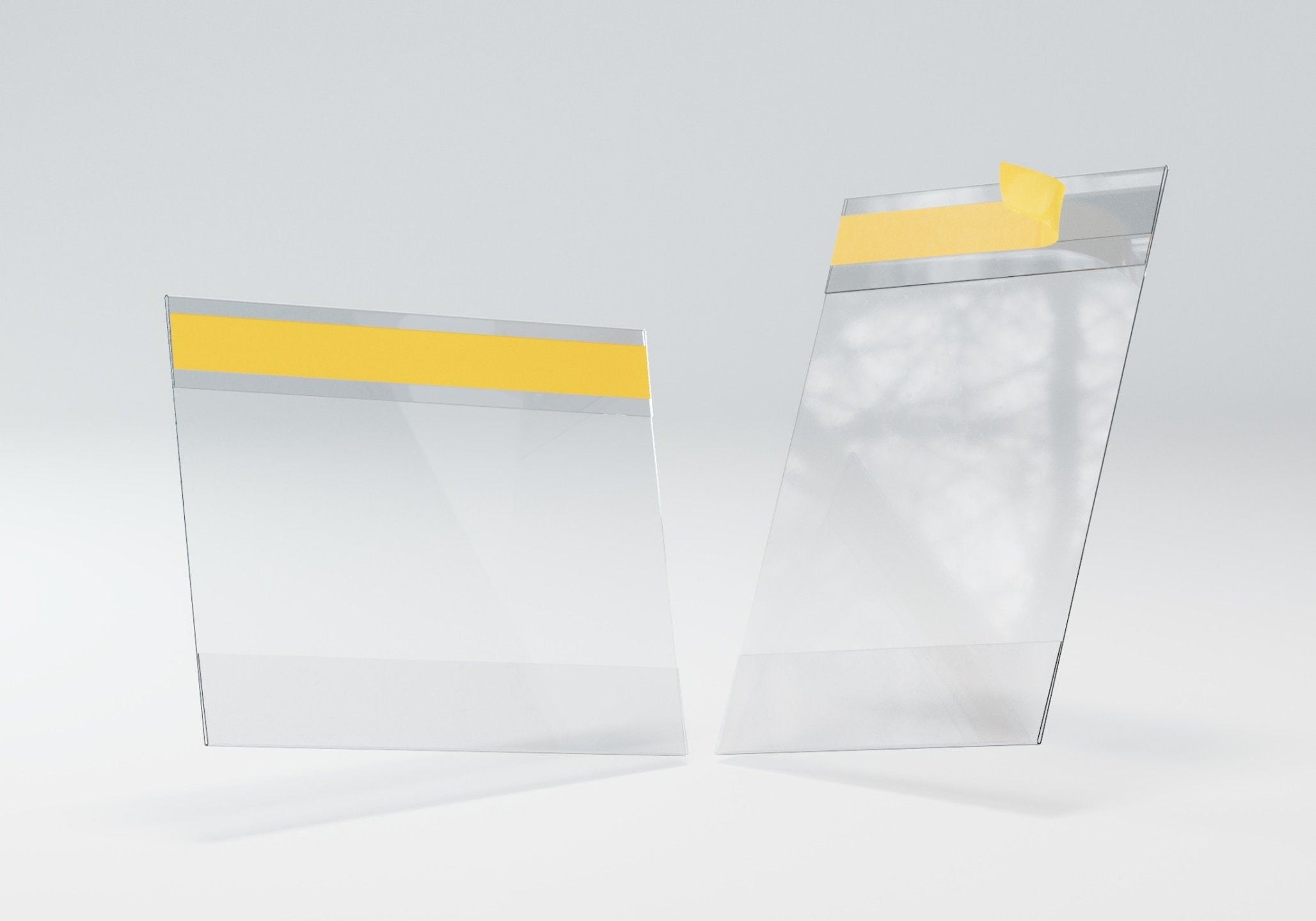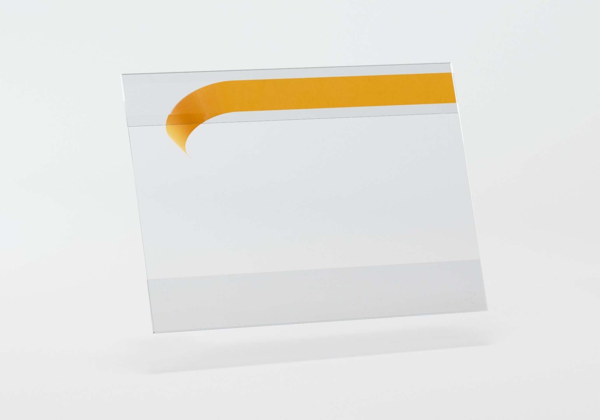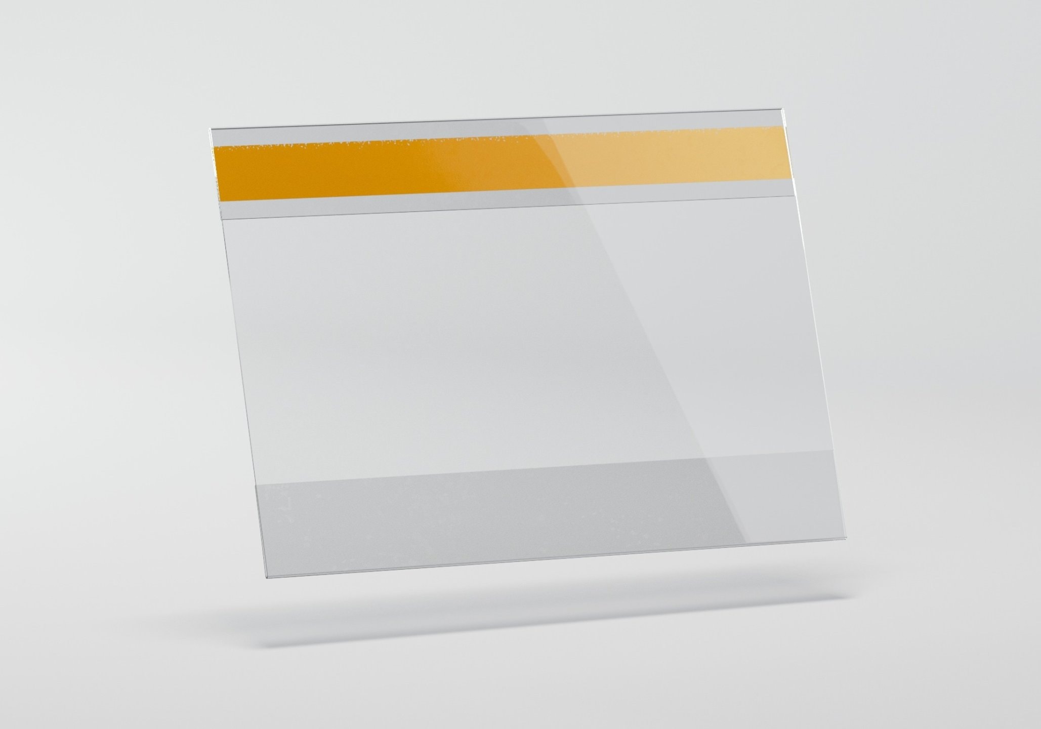 Self-adhesive plastic pocket with two bends made of thin hard plastic. The pocket is designed for inserting a label, leaflet, price tag or label. The pockets are made of hard PVC or PET film from the German manufacturer Klöckner Pentaplast with a glossy or matt (anti-reflective) surface. The thickness of the material used is 0.4 - 0.7 mm, depending on the size. The matt surface is more scratch resistant. The pockets are fitted with transparent, double-sided FG150 tape with a solid PP carrier and rubber adhesive. The tape is suitable for application to most smooth surfaces, plastics, glass, laminate and painted materials, paper and cardboard. On request, we can produce the pockets in an individual design, in a different material or with any type of adhesive tape. The pocket has one self-adhesive tape as standard, if you require two self-adhesive tapes, please write your request in the notes in the order or in the e-mail. You are buying from the manufacturer